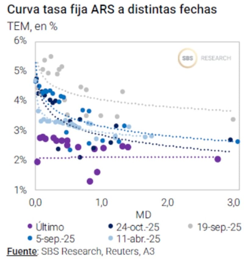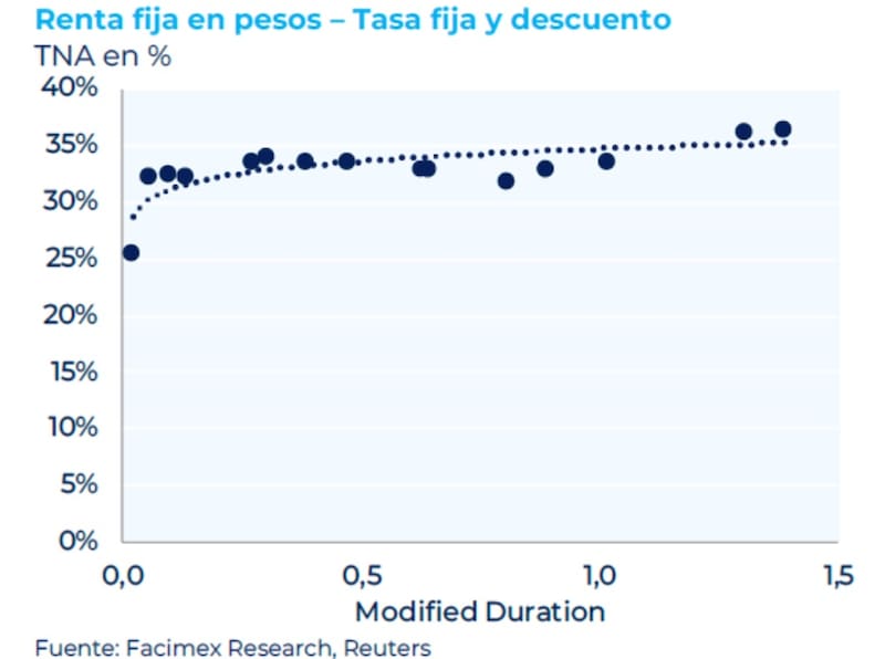 La curva en pesos a tasa fija opera con tasas mas cortas en valores mas altos que los tramos mas largos. Esto no implica temores de default sino que responde a un contexto de menor liquidez y de expectativas de inflación a la baja.