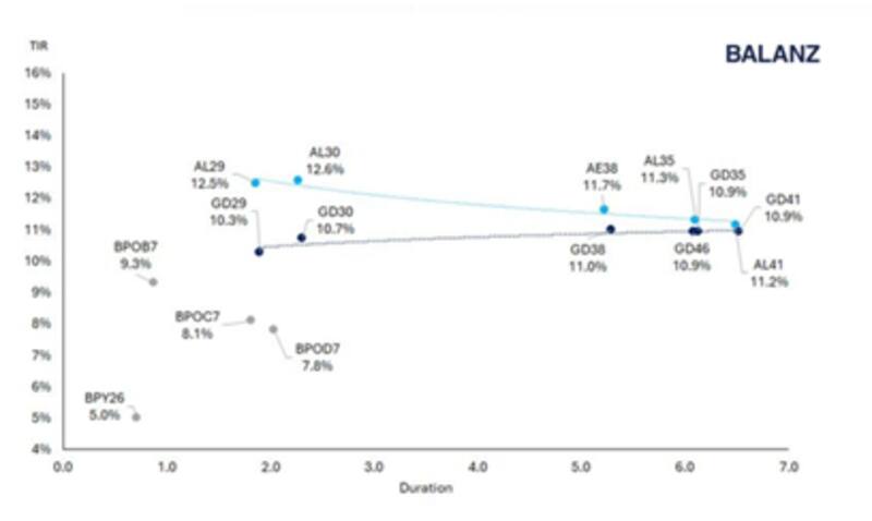 "Sugerimos los GD35 y GD41 para el tramo largo de la curva. Adicionalmente, decidimos favorecer el AL30 para la parte corta dentro de la estrategia Barbell. A partir del buen desempeño de los Bopreales en las últimas semanas, decidimos exponernos en AL30 para la exposición de corto plazo", detalló.