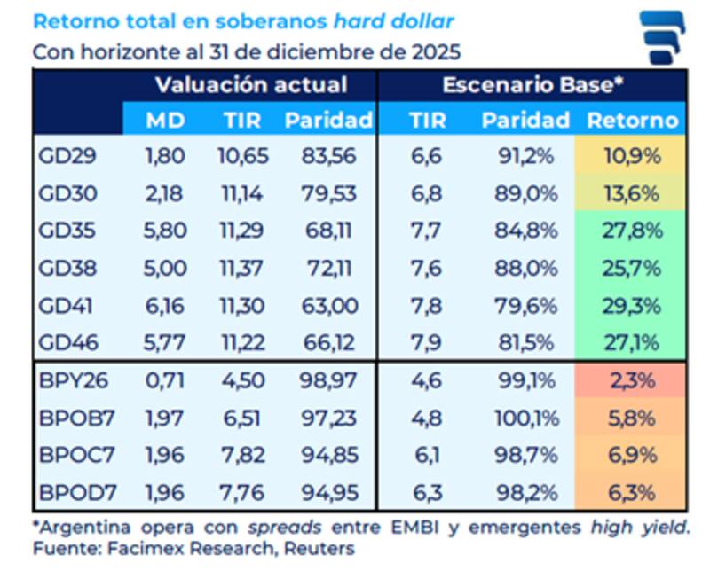 "En soberanos nuestros top picks son el GD41 y el GD35. En nuestro escenario base, los spreads de la deuda argentina estarán entre el EMBI (291pbs) y los emergentes high yield (413pbs) hacia fin de año, consistente con un escenario donde Argentina ya estará en condiciones de acceder al mercado. Esto favorecería particularmente a bonos largos como GD41 y GD35, dejando retornos totales entre 28% a 29% hasta fin de año", dijeron.