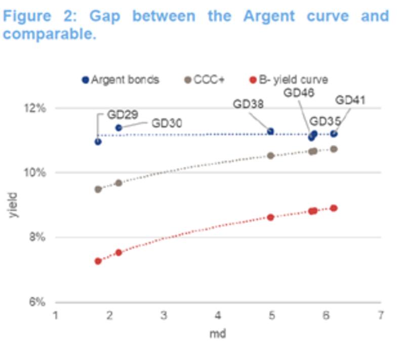"Simulando un ejercicio de rendimiento total de 6 meses en el que la curva soberana logra normalizarse, alcanzando niveles de calificación crediticia B-, el GD38 y el GD35 presentan el mayor potencial de alza, en torno al 18%", estimaron.