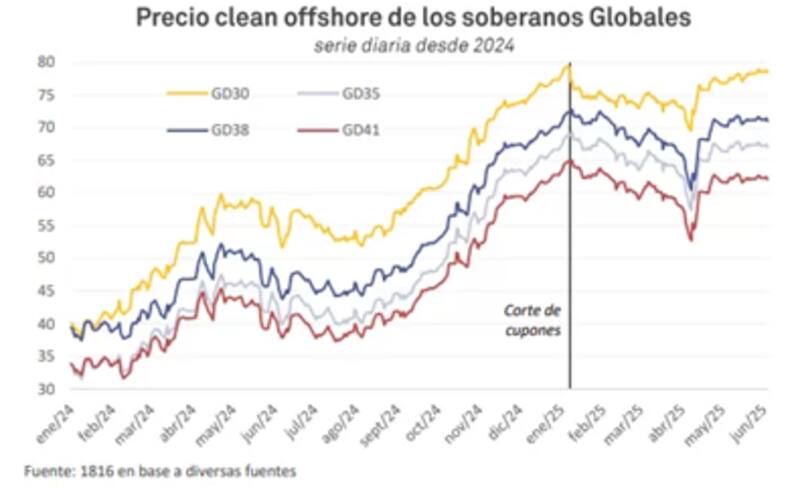 Actualmente, el Global 2029 (GD29) rinde 10,85% y el Global 2030 (GD30), opera con tasas de 10,3%. A su vez, el Global 2038 (GD38) opera también con tasas levemente por encima del Global 2035 (GD35), que rinde 10,2%.