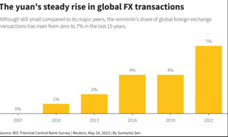 La participación del yuan en las transacciones de divisas extrabursátiles globales aumentó de casi nada hace 15 años al 7%, según el Banco de Pagos Internacionales (BIS).