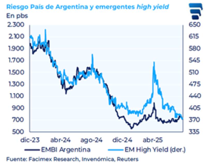 "Este desacople reciente con Argentina yendo a contramano del apetito por activos emergentes, comenzó a revertirse en la última semana, impulsada por señales positivas desde el frente macro y político. El mercado tomó positivamente el dato de acumulación de reservas por parte del Gobierno, que sumó u$s 1500 millones, y el reciente waiver otorgado por el FMI que alivió el cumplimiento de metas", explicaron desde Delphos