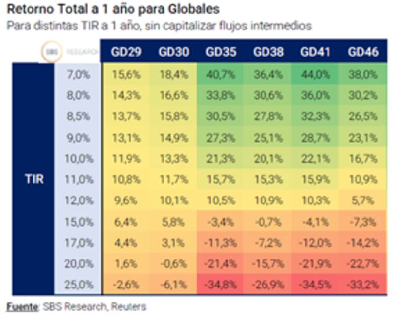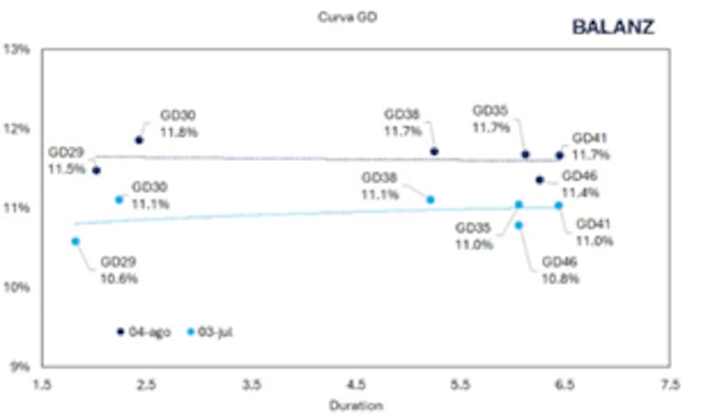 "Dentro de la curva, GD35 se mantiene como top pick, aunque vemos valor también en GD38 y el GD41.Dicho esto, un resultado electoral percibido como positivo por el mercado implicaría mayores subas en el tramo corto (GD29 y el GD30)", afirmó.