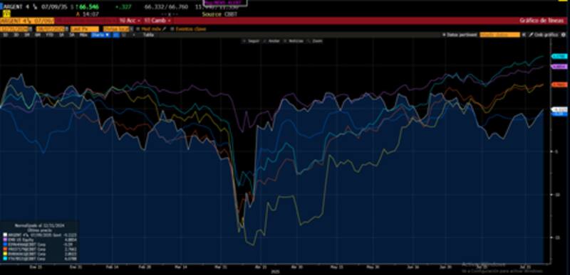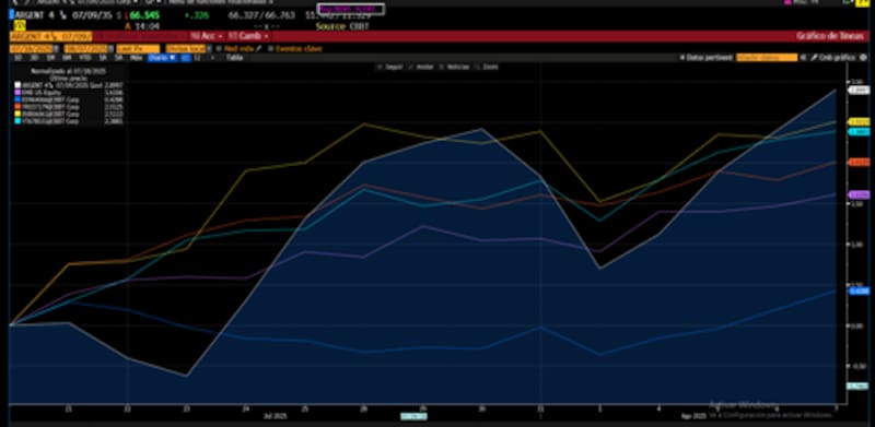 Los bonos soberanos argentinos destacan respecto de sus comparables. En la última quincena, suben 2,9%, por encima de lo que avanzan los títulos de emergentes en dólares (1,4%).