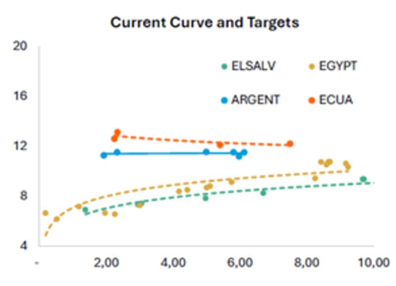 Esto es apenas por debajo del 12,5% que rinde Ecuador. Sin embargo, los bonos de El Salvador o Egipto, por ejemplo, operan con tasas del 7% en el corto plazo y del 8,5% en el tramo medio y largo de la curva.