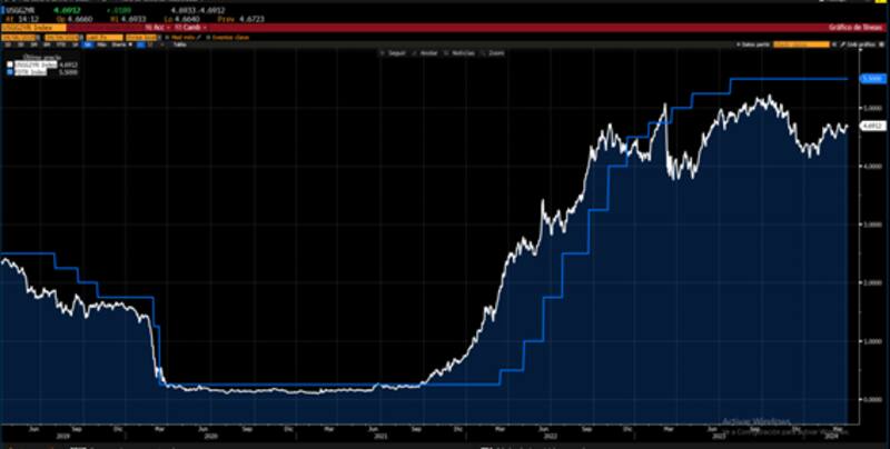 La suba en los rendimientos de los bonos del tesoro americano fue en línea con el aumento en las tasas de interés de EE.UU., ya que la Fed llevó la tasa del 0% al 5,5% actualmente.