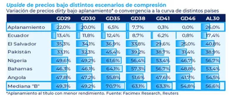 "Un escenario donde la curva de Argentina converge hacia la mediana de los créditos calificados como "B" por S&P Global Ratings generaría retornos directos en torno al 49% para el tramo corto, 63% para los 2038 y 2041 y 71% para el GD35", sostuvo.