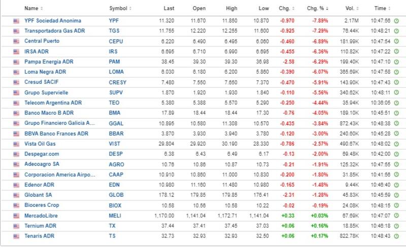 Otras acciones como Central Puerto, IRSA, Pampa, Loma Negra, Cresud, Grupo Supervielle, Telecom y Banco Macro bajan entre 4% y 6,5%.