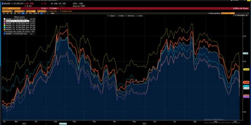 Con la caída actual los bonos argentinos se ubican entre los mínimos de octubre y rozando también valores de mayo pasado, colapsando sus paridades a niveles de 23%.