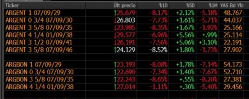En el tramo medio, los bonos a 2035 y 2038 pierden 8,35% y 7% respectivamente.