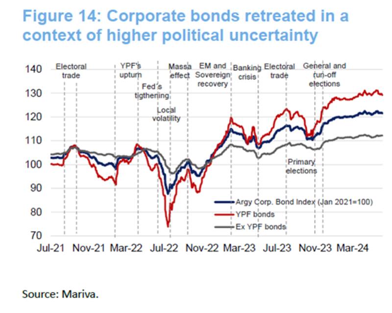 También, desde Research Mariva agregaron que YPF emitió un nuevo bono internacional con vencimiento en 2031 por USD 800 millones y obtuvo una aceptación del 40% de la oferta pública de bonos 2024.