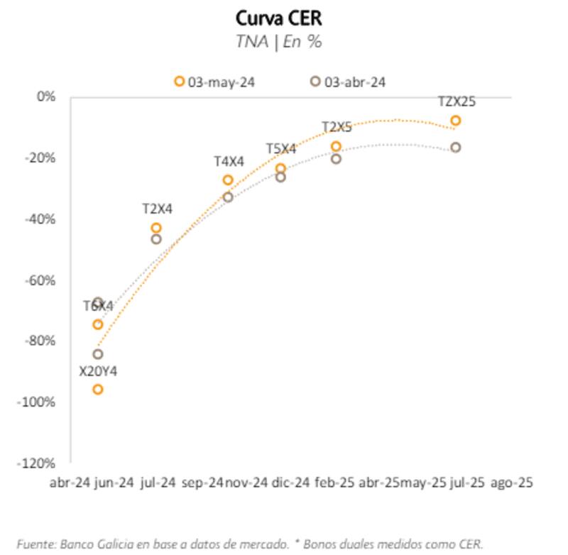 Hoy la curva CER opera con tasas de -85% en el tramo corto, saltando a niveles de entre -40% y -20% en los bonos de hasta comienzo de 2025.