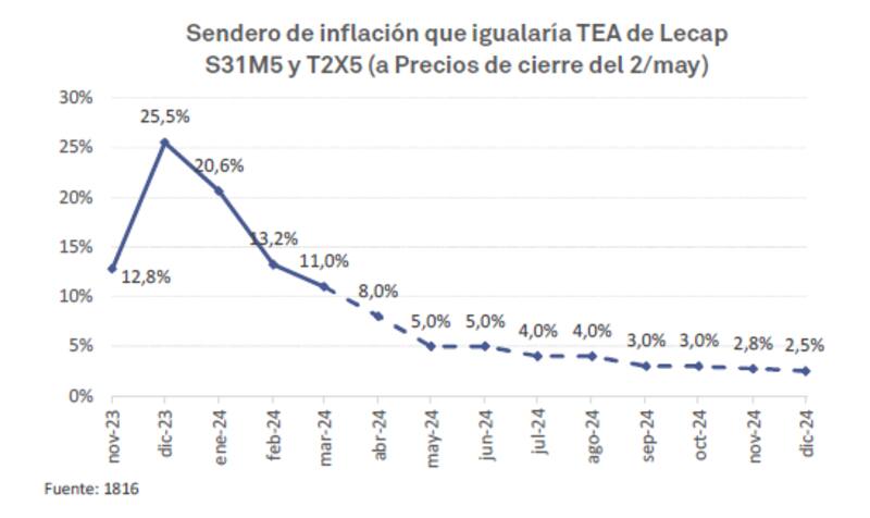 Al cierre de la semana pasada, las Lecap tienen en precios una inflación del 5% en mayo, que seguiría apuntando a la baja.