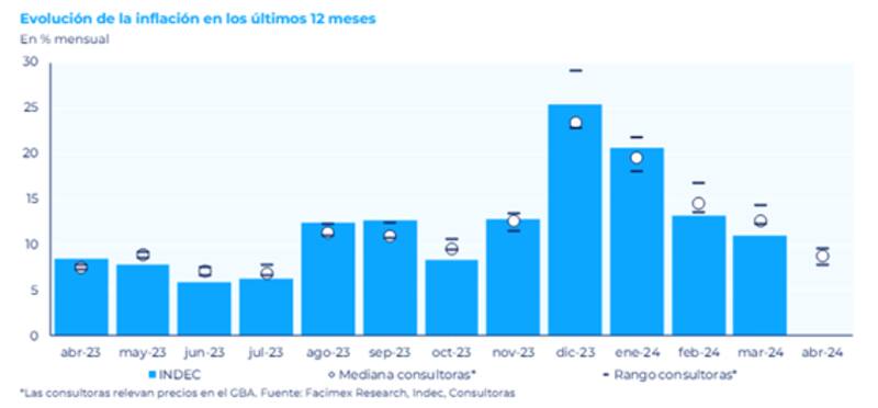 "Las mediciones privadas estuvieron en un rango del 7,8-9,6% para abril, con una mediana del 8,8% mensual. Todas las mediciones estuvieron por debajo de sus propios registros de marzo y del 11,0% mensual que reportó el Indec para marzo", dijeron.