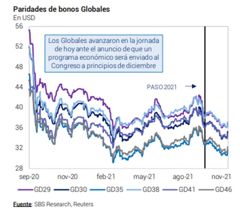 "Los bonos soberanos en dólares pierden 15% desde las primarias de septiembre. Las noticias sobre el resultado de las elecciones y los comentarios sobre el potencial acuerdo con el FMI no fueron suficientes para impulsar el precio de estos activos. A esta altura de los acontecimientos, luego de la larga y difícil reestructuración de deuda, solo avances contundentes determinarán la mejora en los precios de estos bonos", sostuvo.