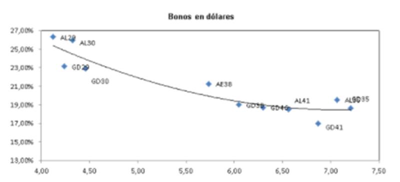 Si se toma la curva soberana en dólares de ley local, el escenario es aún más dramático. Los bonos rinden 27% en el tramo corto y 21% en el tramo más largo.