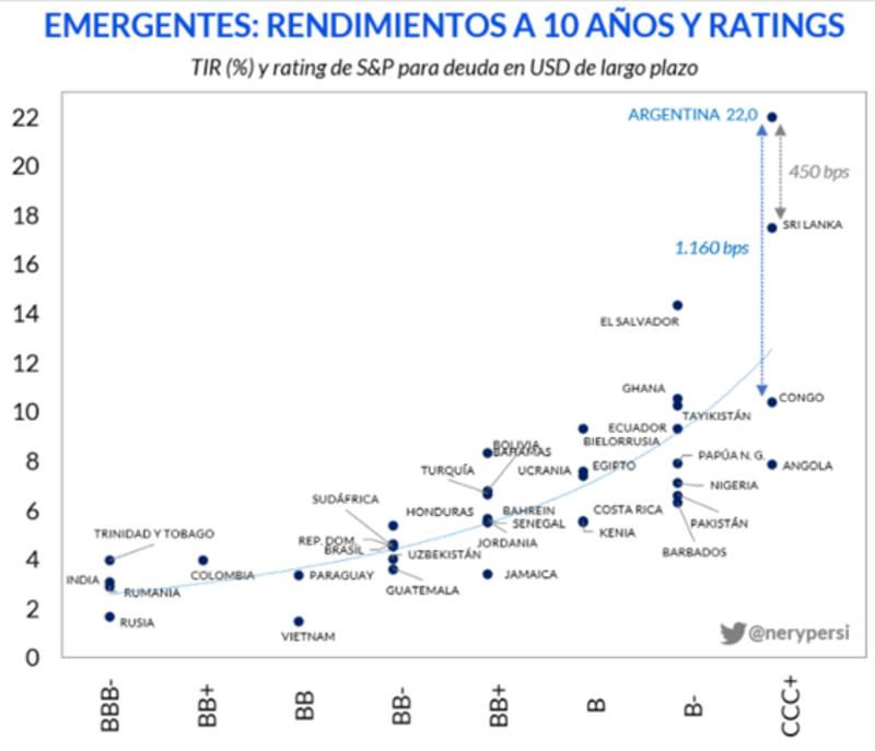 En ese mundo de tasas ultra bajas, incluso para los países más comprometidos económica y políticamente, la Argentina rinde nada menos que 22%. La deuda local opera con tasas por encima incluso que Sri Lanka que rinde 18%.