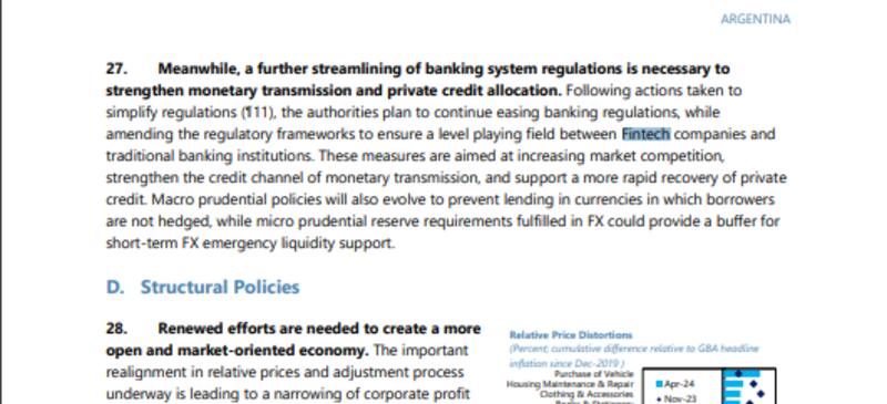"Después de las acciones tomadas para simplificar las regulaciones, las autoridades planean continuar flexibilizando las regulaciones bancarias, mientras modifican los marcos regulatorios para garantizar la igualdad de condiciones entre las empresas Fintech y instituciones bancarias tradicionales", se afirma en el punto 27 del Staff Report.