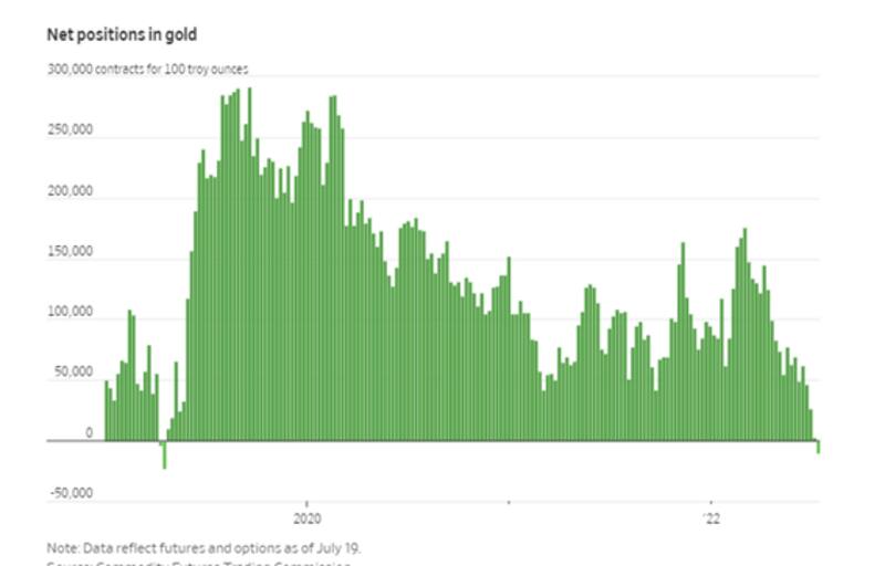 Según consigna Wall Street Journal, los fondos de inversión se han vuelto bajistas netos, con más apuestas por la caída de los precios del oro que por el aumento, por primera vez en más de tres años. Así lo reflejan los datos de la Comisión de Comercio de Futuros de Productos Básicos que rastrean futuros y opciones.