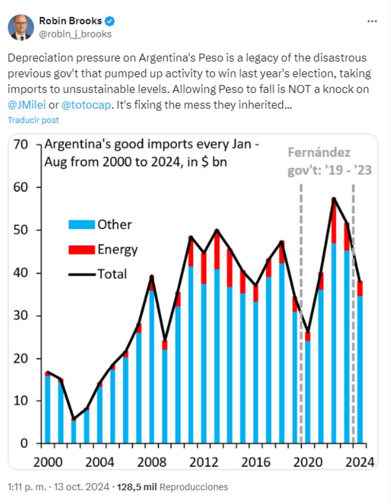 "La presión depreciatoria sobre el peso argentino es un legado del desastroso gobierno anterior que impulsó la actividad para ganar las elecciones del año pasado, llevando las importaciones a niveles insostenibles. Permitir que el peso caiga NO es un golpe a Javier Milei y a Luis Cuputo. Está arreglando el desastre que heredaron...", amplió.
