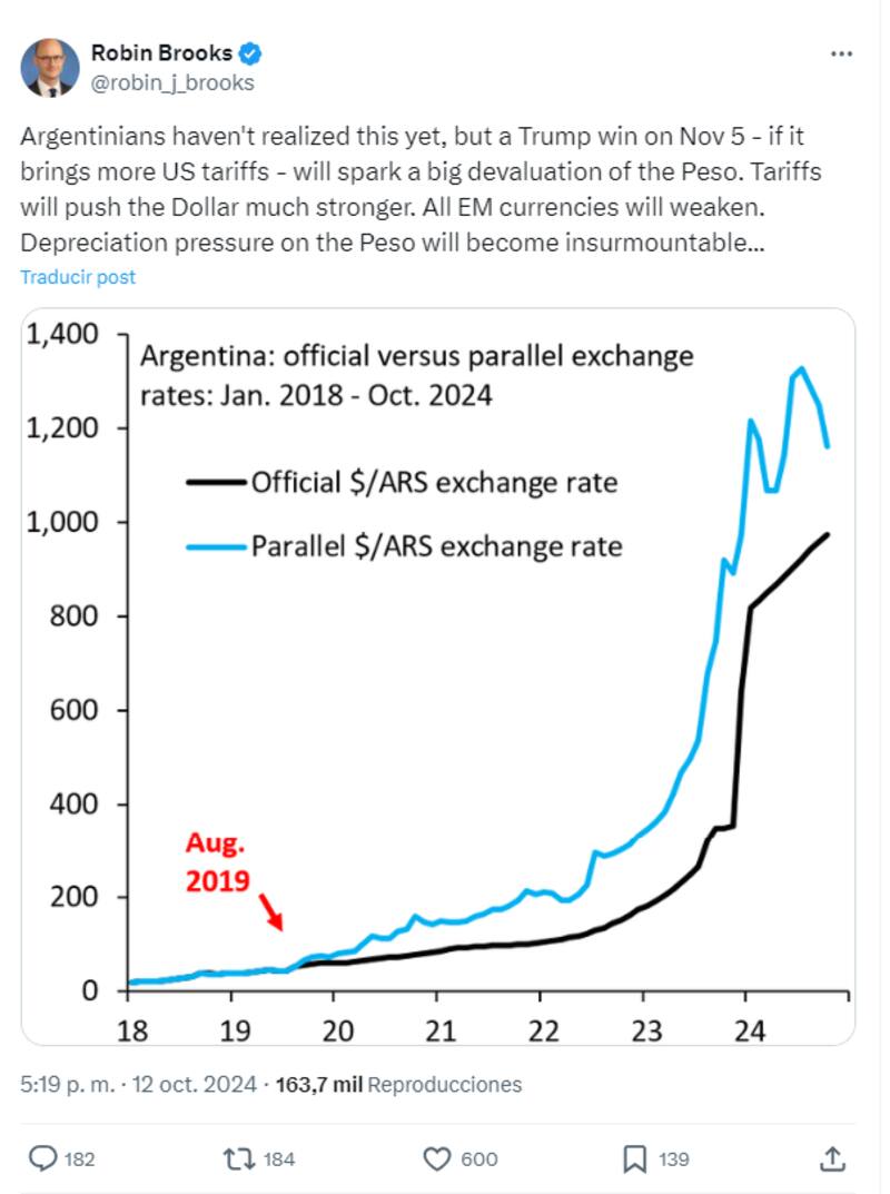 "Los argentinos aún no se han dado cuenta de esto, pero una victoria de Trump el 5 de noviembre (si implica más aranceles estadounidenses) provocará una gran devaluación del peso. Los aranceles harán que el dólar se fortalezca mucho más. Todas las monedas de mercados emergentes se debilitarán. La presión depreciatoria sobre el peso se volverá insuperable...", indicó Brooks.
