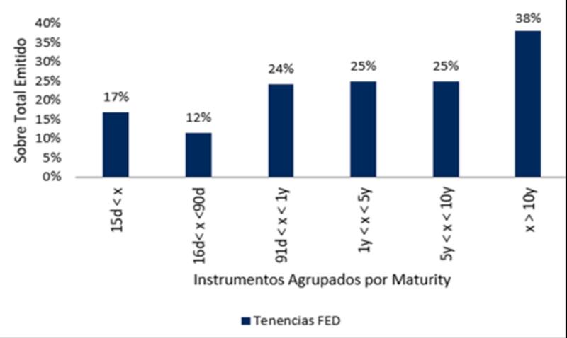 "Agrupado por maturity, podemos ver que la Fed tiene una mayor participación sobre el total emitido en títulos que tienen maturities superiores a un año. Más allá de la fuerte volatilidad que vimos en las últimas semanas, de mediano plazo el Quantitative Tightening parece impregnarle presión alcista a las tasas largas", advirtió.