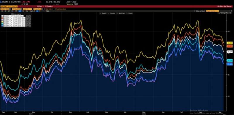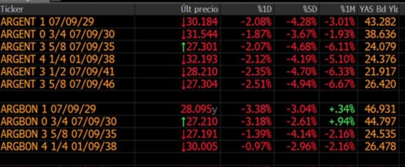 Finalmente, en el extremo más largo, los bonos a 2041 y 2046 bajan 18% y 14,9% respectivamente desde los picos alcanzados antes de las elecciones de agosto.