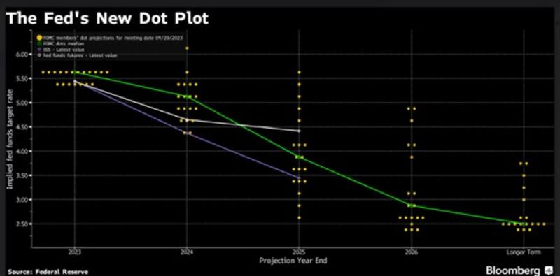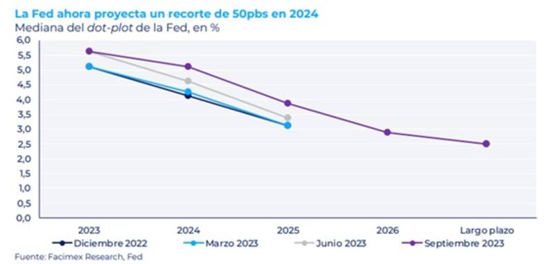 "El nuevo dot-plot ahora descuenta una baja de tasas de 50pbs el próximo año a 5,00-5,25%, cuando en junio proyectaba un recorte de 100pbs a 4,50-4,75%. Esta voluntad de mantener tasas más altas por más tiempo probablemente se explique por el hecho de que las nuevas proyecciones macroeconómicas de la Fed muestran una economía más sólida", señaló.