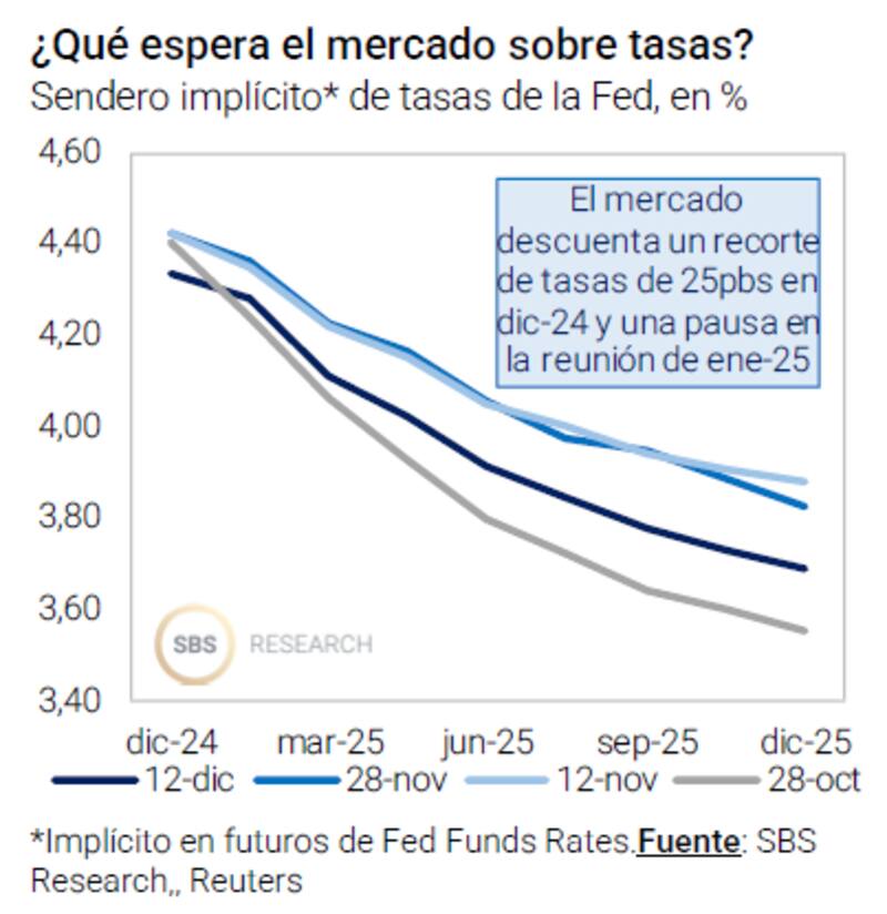 Para 2025 el mercado tiene descontado dos recortes de tasas de interés adicional, lo cual es mucho menos de los 4 que supo proyectar en algún momento de 2024.