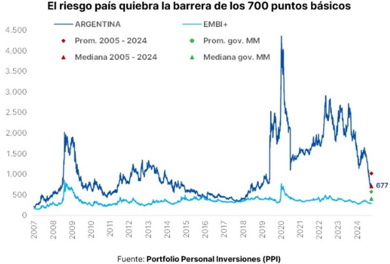 Para Adrián Yarde Buller, economista jefe de Facimex Valores, el riesgo país caería a 550 a 575pbs en el primer semestre de 2025, recuperando el acceso al mercado para refinanciar los vencimientos de capital de julio.