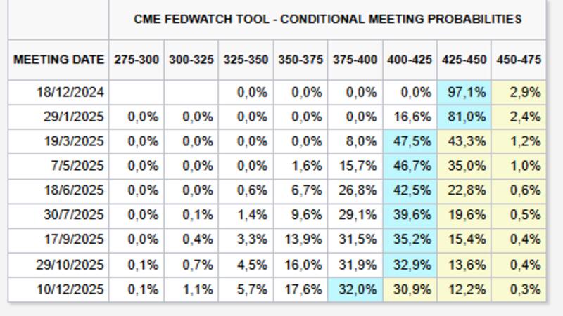 Actualmente, la probabilidad de ver un recorte de 25 puntos básicos para la reunión del 18 de diciembre es del 97%, contra un 3% de que la Fed no aplique ningún recorte.