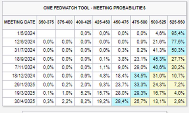 El mercado ve con un 95% de probabilidad que la Fed mantendrá sin cambios la tasa de interés en mayo en niveles actuales de 5,25% y 5,5%.