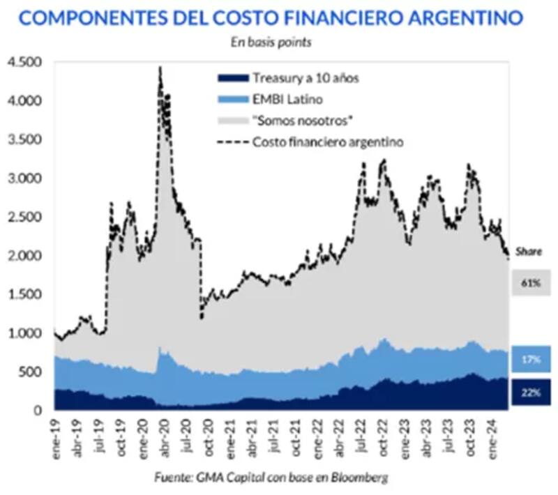 Los otros componentes de la tasa en dólares de los bonos argentinos incluyen un 17% que está ligado al riesgo latinoamericano y un 22% atado a la tasa libre de riesgo internacional, es decir, a los bonos del tesoro americano.