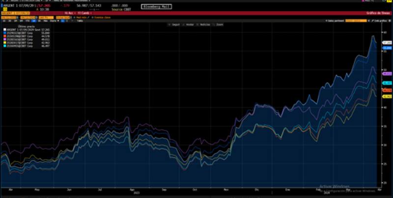 "Si bien creemos que el reciente aumento de demanda de los activos argentinos está más relacionado con la evolución de la macro en los primeros 100 días del gobierno de Milei, y en los factores idiosincráticos domésticos, sin dudas existe cierta correlación entre el mercado local y el mercado externo. Vemos probable que la deuda argentina corrija levemente -o al menos se tome un descanso- en el marco de un ´fly to quality´", comentó Calvente.