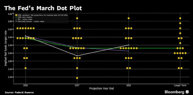 Aun así, el mensaje implícito es claro: por ahora, la Fed opta por mirar más allá del shock energético y evitar sobrerreaccionar en política monetaria. De hecho, ningún funcionario proyecta subas de tasas para lo que resta del año, aunque aparece una señal aislada que anticipa un eventual endurecimiento recién en 2027.