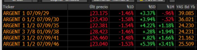 Por su parte, los Globales a 2035 y 2038 pierden 1,53% y 1,46% respectivamente, mientras que los bonos más largos, a 2041 y 2046 exhiben bajas de 1,48% y 1,53% respectivamente.