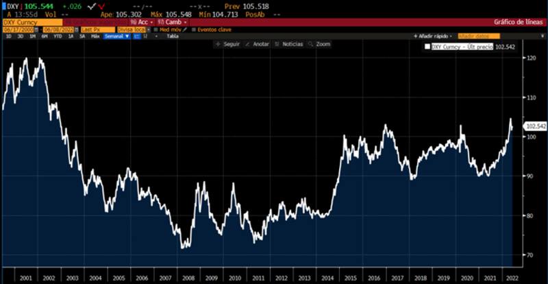 El escenario de apreciación del dólar efectivamente ya se está viendo, con el dólar index fortaleciéndose contra el resto de las monedas y alcanzado su mayor nivel desde comienzo de la década de los años 2000. Sube 13% desde sus mínimos del 2021 y 8% este año.
