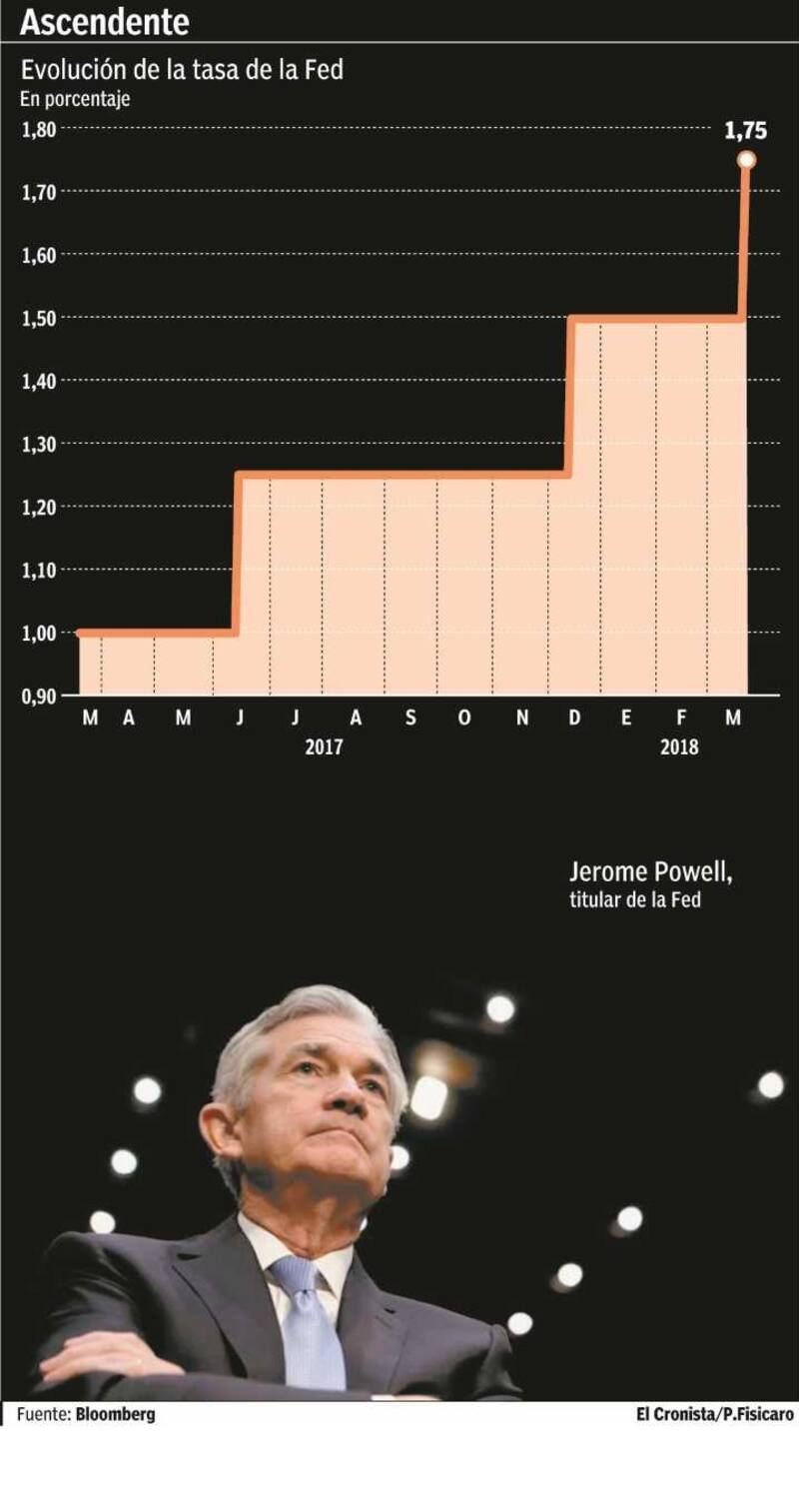 En la primera reunión presidida por Jerome Powell, la Reserva Federal (Fed) de Estados Unidos aumentó ayer su tasa por primera vez en 2018. El incremento fue de 25 puntos básicos y llevó a la referencia al rango de entre 1,50% y 1,75%. El Comité de Política Monetaria dio señales de que habrá otros dos aumentos en lo que resta del año.