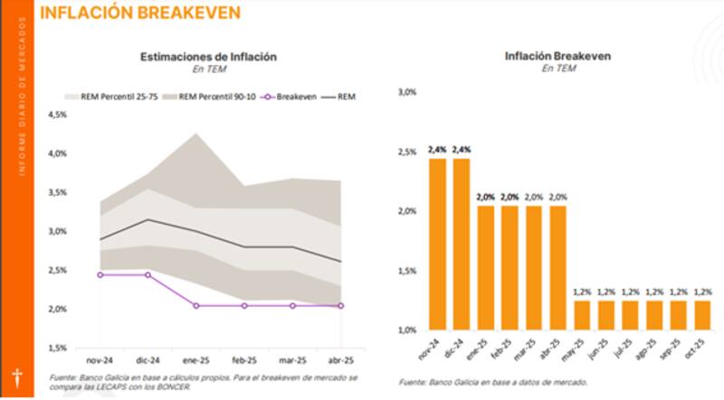 Según cálculos de Banco Galicia, la inflación break even ajustó a la baja, ubicándose en 2,4% para los últimos dos meses del año, 2% promedio mensual entre enero y abril del 2025, y 1,2% mensual entre mayo y octubre del próximo año.