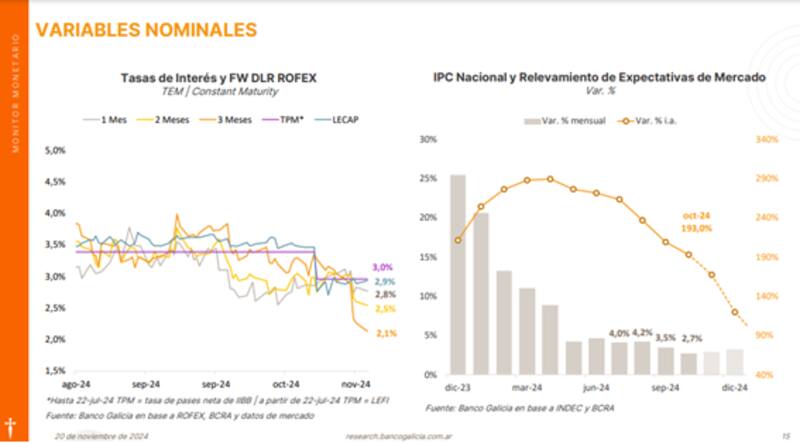 "Los precios de mercado tienen implícito una inflación de 2,2% m/m para el último bimestre de 2024, algo por debajo de nuestras estimaciones de 2,6%. Algo similar ocurre a plazos más largos: la inflación breakeven es de 21% interanual para 2025, en tanto que nosotros esperamos una variación más cercana al 30% interanual", afirmó.