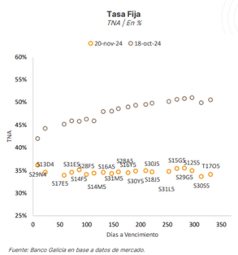 Estos son niveles de tasa de interés sustancialmente menores respecto de las tasas con las que operaba hace un mes atrás cuando la curva tenía pendiente positiva y con rendimientos del 42% al 52% a lo largo de la curva.