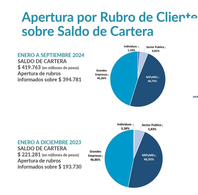 El financiamiento para pymes es liderado por The Capita Corporation, de Banco Comafi, con el 20% del financiamiento otorgado, seguido por Banco Supervielle y BICE. A grandes empresas, lidera HPE Financial Service, con $ 68.712 millones en cartera, seguido por The Capital Corporation y Banco Supervielle.