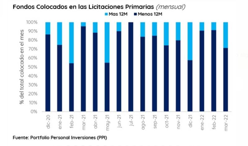 Según datos de los analistas de Portfolio Personal Inversiones, si se toman los próximos 12 meses, el 82.4% de lo colocado este año fue a un plazo menor a un año.