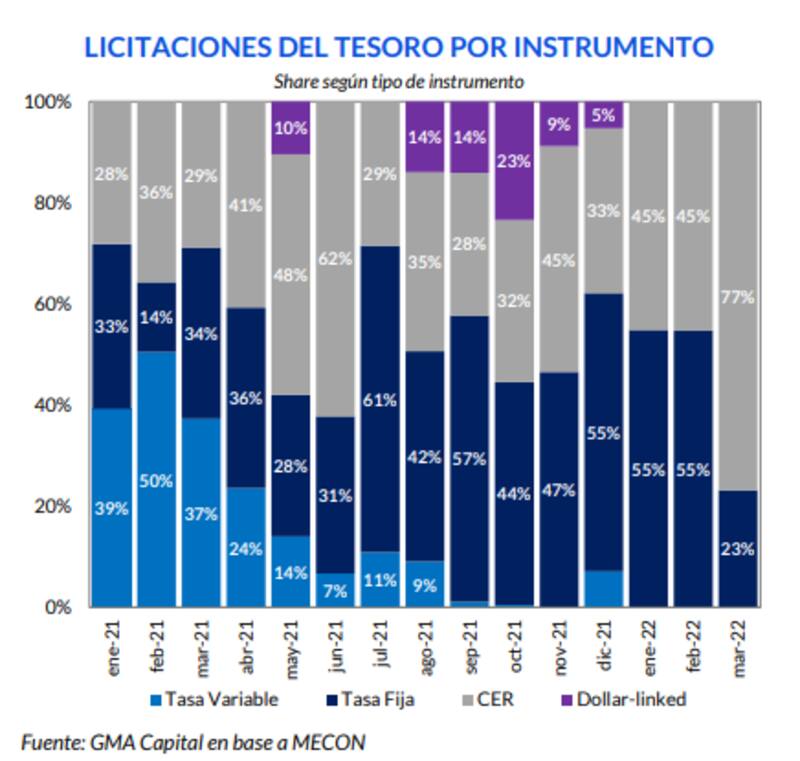 "La composición de ajustables por CER también se incrementó notoriamente (aprovechando la demanda del mercado). De hecho, el 76.8% de lo captado en las operaciones primarias de marzo fue vía activos que ajustan por CER (vs 45.1% de enero)", dijo.