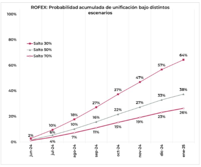 Esto significa que, hasta diciembre, hay una probabilidad implícita de 57% para un salto cambiario del 30%; de 33% para un salto cambiario del 50%; y de 23% para un salto cambiario del 70%.