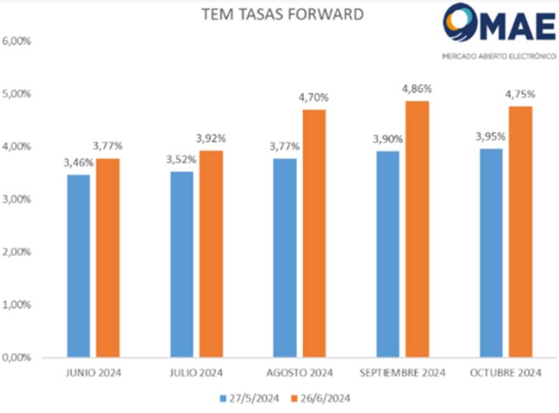 En cambio, se ve un mayor salto para los contratos de agosto en adelante. Para el octavo mes del año, el mercado opera con una devaluación mensual del 4,7% (TEM) en MAE, por encima del 3,7% de hace un mes.