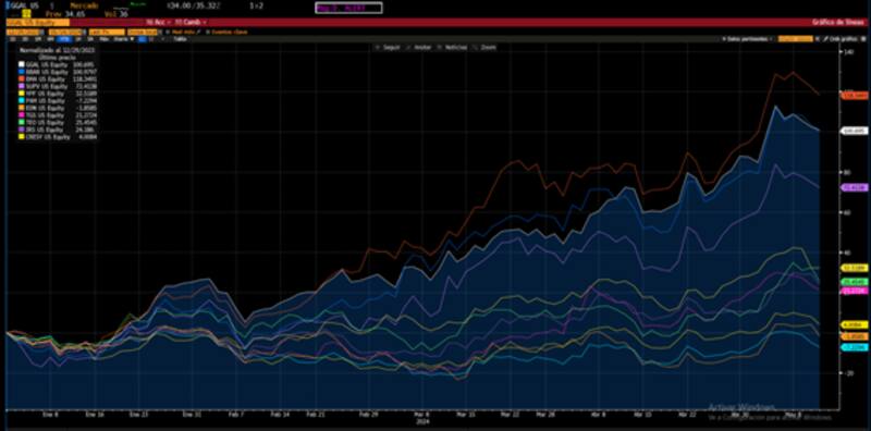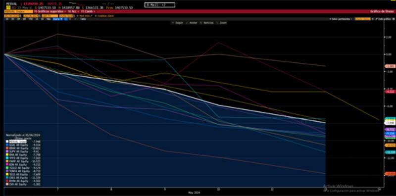 Los demás papeles en pesos también operan con pérdidas, seguido por Grupo Financiero Galicia, Grupo Supervielle, YPF, Banco Macro, Edenor, TGS, TGN, y Telecom, que muestran caídas de entre 7,5% y 9,5% en pesos en la última semana y desde sus picos recientes.