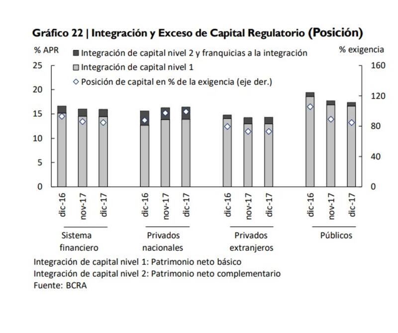 Sin embargo, en una comparación interanual, este ratio se redujo levemente (-0,7 p.p.) fundamentalmente en los bancos públicos y en los privados extranjeros. Esta disminución fue atribuída al aumento de los APR, impulsados por “el dinamismo del crédito al sector privado .
