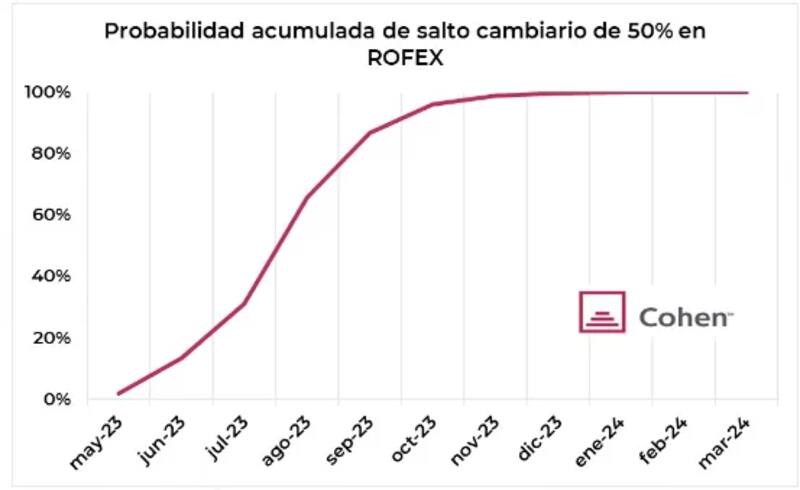 Para el resto de la curva, la probabilidad de una devaluación salta al 87% en septiembre y 96% a octubre de este año, para luego converger al 99% en los últimos meses del año y primeros meses del 2024.